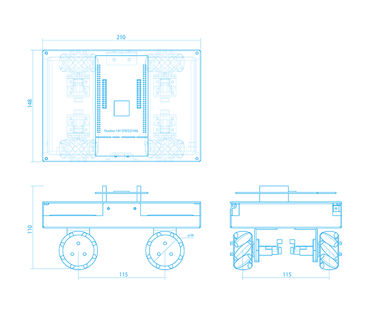 メカナムホイールは、45°傾いた樽型ローラーで構成された特殊な車輪です。4つの車輪を個々に制御することで定置旋回や車体の向きを変えずに全方向移動が可能です。 センサやカメラを搭載すれば、ものを避けたり追いかけたり、まさに「ロボット」さながらの動きをします。制御用マイコンとして STM32Nucleoを標準で搭載しており、開発環境は無償の「STM32CubeIDE」や「Mbed」を利用できます。STM32用のサンプルソースをご用意しておりますので、すぐに動かしてみることができます。